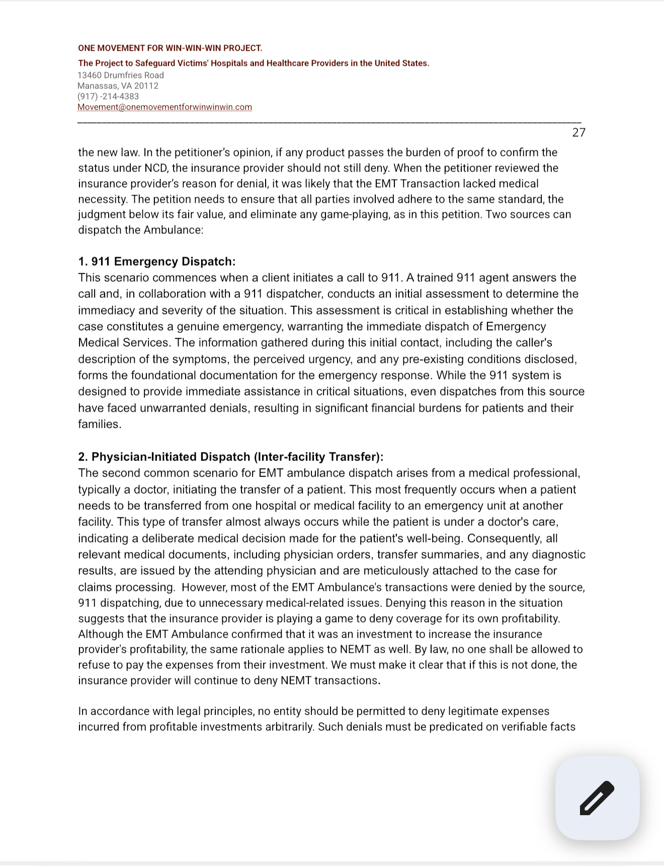 The "One Movement For Win-Win-Win Project" petition will articulate the rationale for this transition and challenge the antiquated position of the Medicare and MEDCAC committees, which has led to their reluctance to include NEMT within the National Coverage Determination (NCD), thereby freeing our Hospitals and Healthcare Providers from a victim